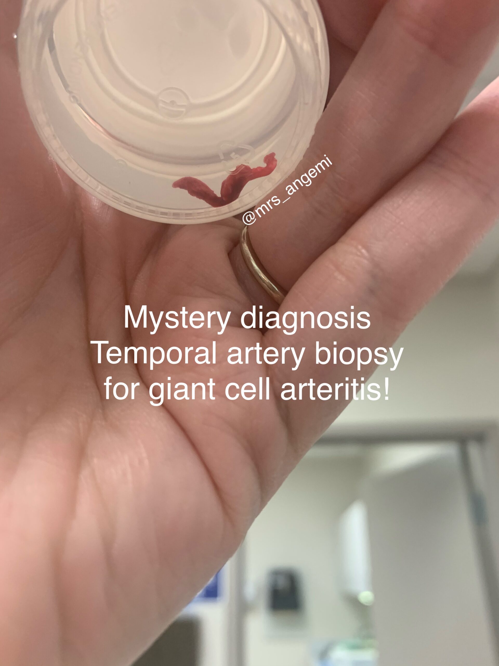 Mystery Diagnosis: Temporal Artery Biopsy for Giant Cell Arteritis Gallery Mystery Diagnosis: Temporal Artery Biopsy for Giant Cell Arteritis By Nicole Angemi|2024-09-11T16:33:24-04:00March 9th, 2021|MEDICAL, Mystery Diagnosis, GAMES, The Gross Room| Read More 6
