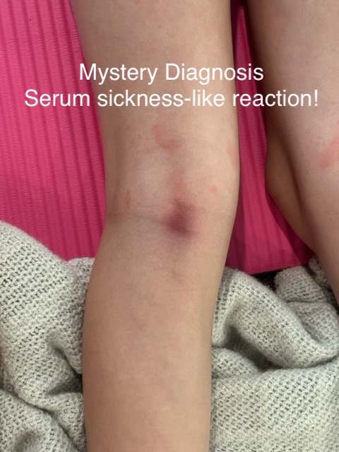 Mystery Diagnosis: Serum sickness-like reaction! Gallery Mystery Diagnosis: Serum sickness-like reaction! By Nicole Angemi|2024-09-11T16:29:40-04:00August 28th, 2023|The Gross Room, MEDICAL, Mystery Diagnosis, GAMES| Read More 10